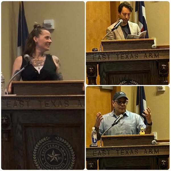 I had a great reading with authors Khimen Cooper and JD Isip at East Texas A&M on April 24th! I got to read my story “Tender: Notes on Dating” from The Avalon Review! Fun readings and great times with old friends! See our books below.